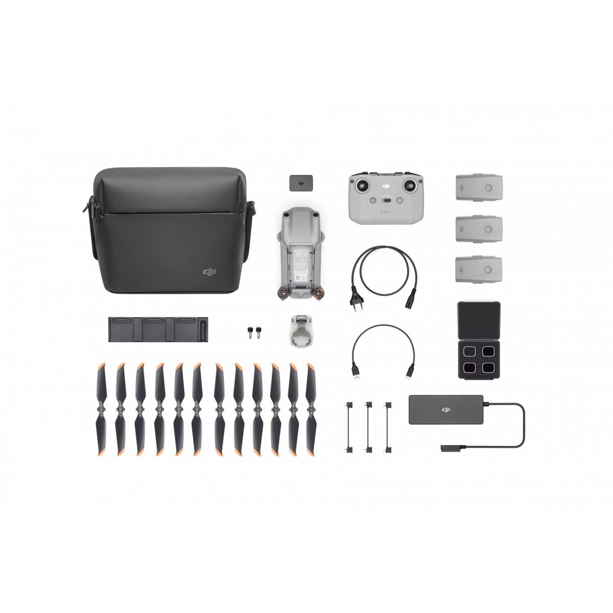 Obsah balení: 1x Dron DJI Air 2S, 1x Dálkový ovladač, 3x Inteligentní baterie, 1x Nabíjecí stanice pro tři akumulátory, 1x Nabíječ, 1x Napájecí kabel, 1x Power bank adaptér, 2x Ovládací kniply (pár), 1x Krytka gimbalu, 1x ND Filter Set (ND4/8/16/32), 6x Low-Noise vrtule (pár), 1x Přepravní taška, 1x RC kabel Micro USB-C, 1x RC kabel Lightning, 1x RC kabel Micro USB, 1x Kabel Type-C, 1x CZ manuál