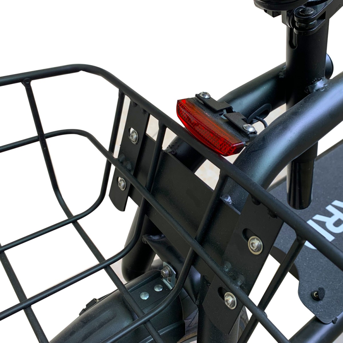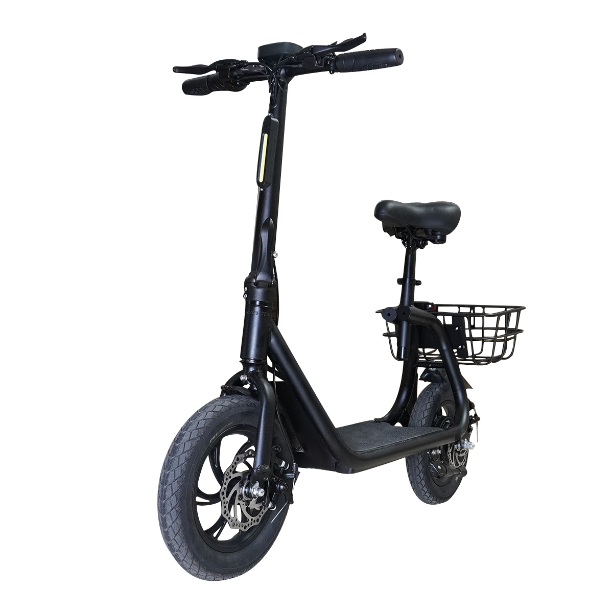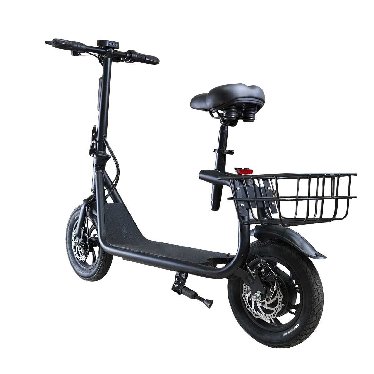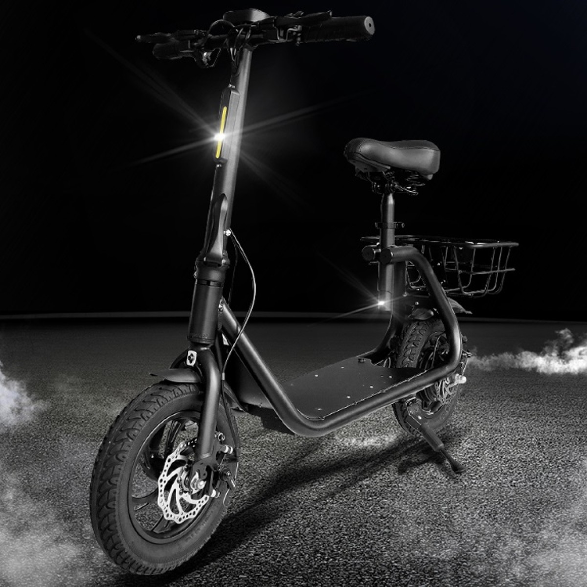 Elektrokoloběžka má kotoučovou brzdu. Bezpečně za jízdy i v noci, elektrokoloběžka obsahuje osvětlení, díky kterému Vás na silnici nemůže nikdo přehlédnout. Na košíku, který je umístěn nad zadním kolem koloběžky, je navíc připevněna odrazka, což bezpečnost dále zvyšuje.