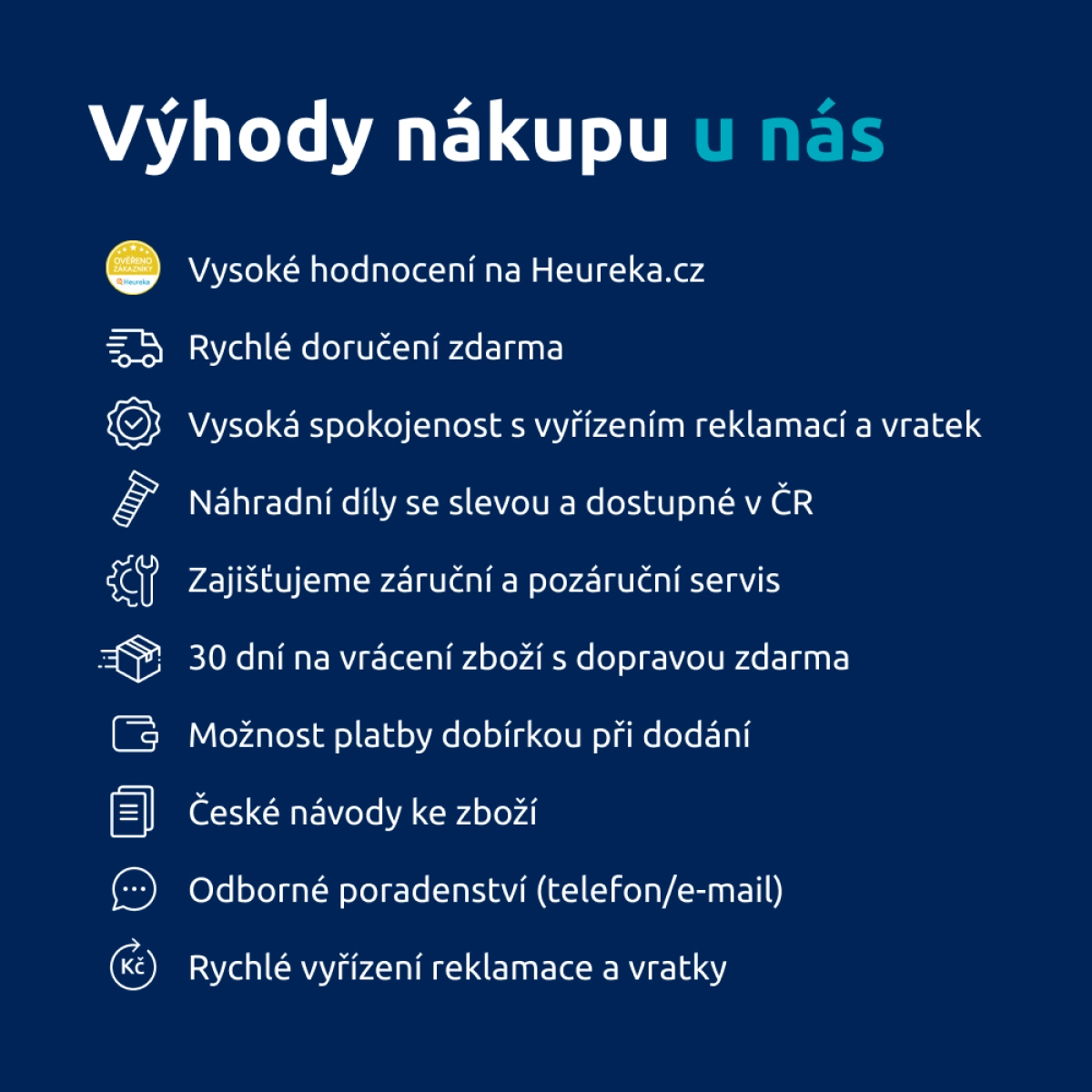 Velmi jednoduché ovládání, Dostatečný výkon, Ovladač, kolečka pro snadnou manipulaci