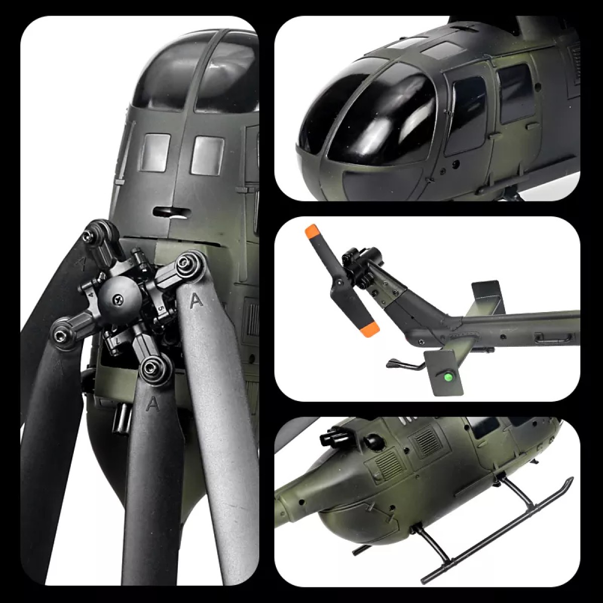 Díky postranním křídlům má tato helikoptéra i ve vzduchu skvělou stabilitu. Díky svým kompaktním rozměrům a nízké hmotnost určitě oceníte také výbornou ovladatelnost a manévrovatelnost. Obdivovatelé armádní techniky budou nadšeni z vojenského maskování.