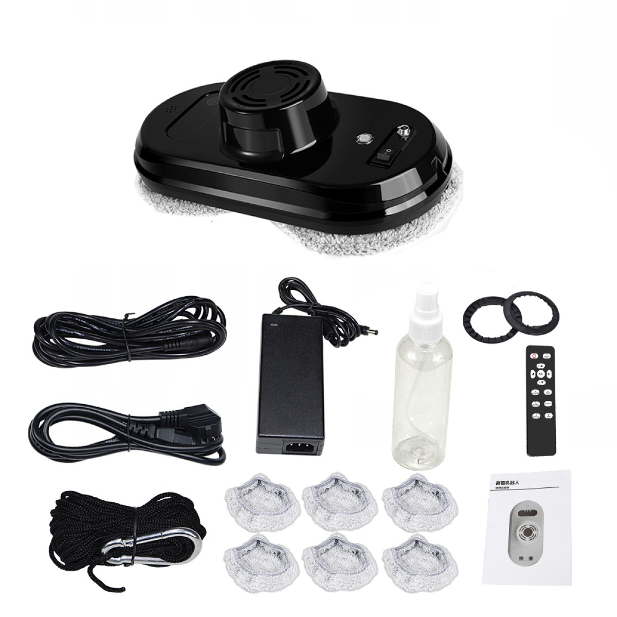 čistič oken, adaptér, nabíjecí kabel, dálkový ovladač + 2 kusy baterie typu AAA, lahvička s rozprašovačem, návod k obsluze