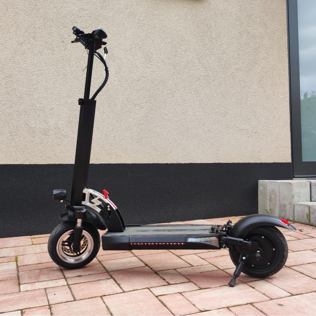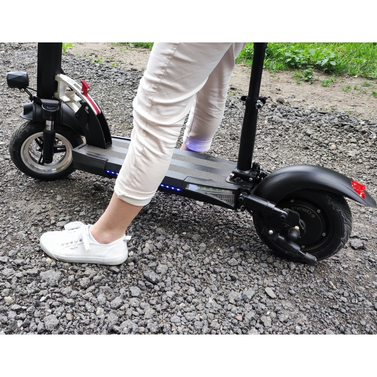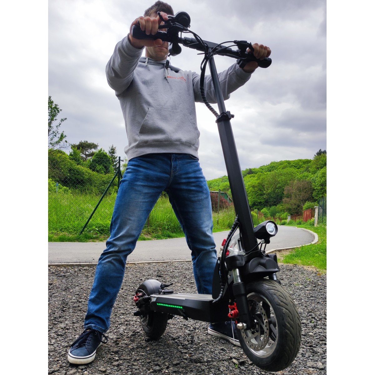 Výkonná a praktická elektrokoloběžka s pohodlným sedákem je tou pravou volbou pro vaši cestu za nákupy, či projížďku městem na místo určení. Kvalitní odpružení navíc umožňuje koloběžku využívat i mimo zpevněné cesty. Překvapí Vás především dlouhý dojezdem a to až 60 km na jedno nabití! Při jízdě dosahuje rychlosti až 40 km/h. Elektrokoloběžka disponuje praktickým LCD displejem, na kterém je ukazatel rychlosti a stavu baterie. Tato elektrokoloběžka má nosnost úctyhodných 120 kg. Samotná elektrokoloběžka disponuje relativně nízkou váhou a to 25 kg, díky které se s koloběžkou skvěle manipuluje. Díky praktické svítilně budete mít na cestě rozhled i za šera, nebo za tmy. Elektrokoloběžka je vybavena stojanem, takže ji můžete postavit kdekoliv se vám zamane.