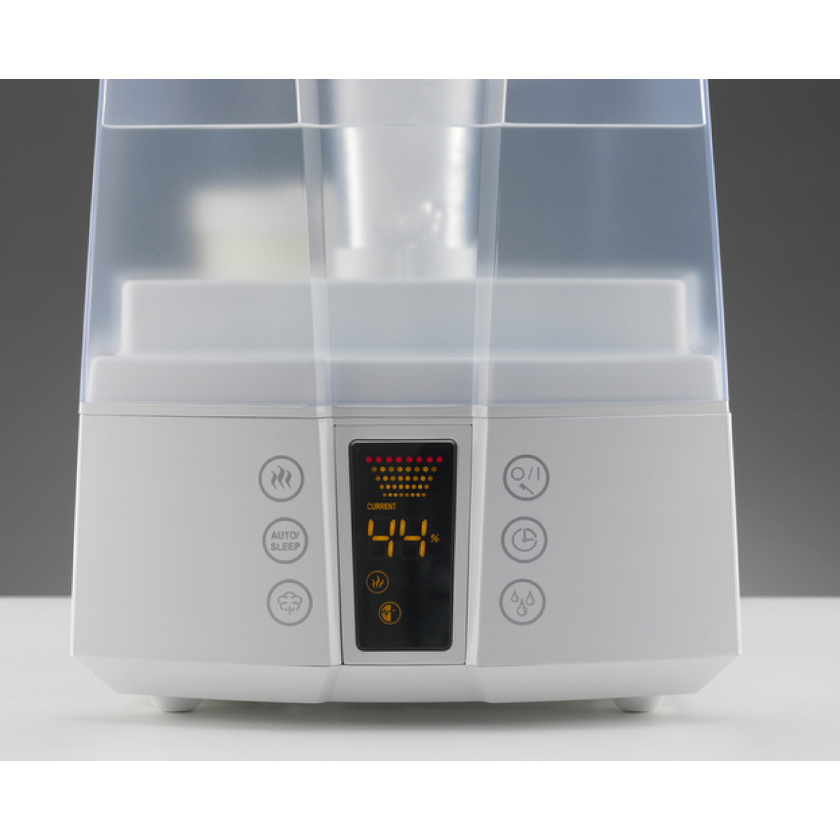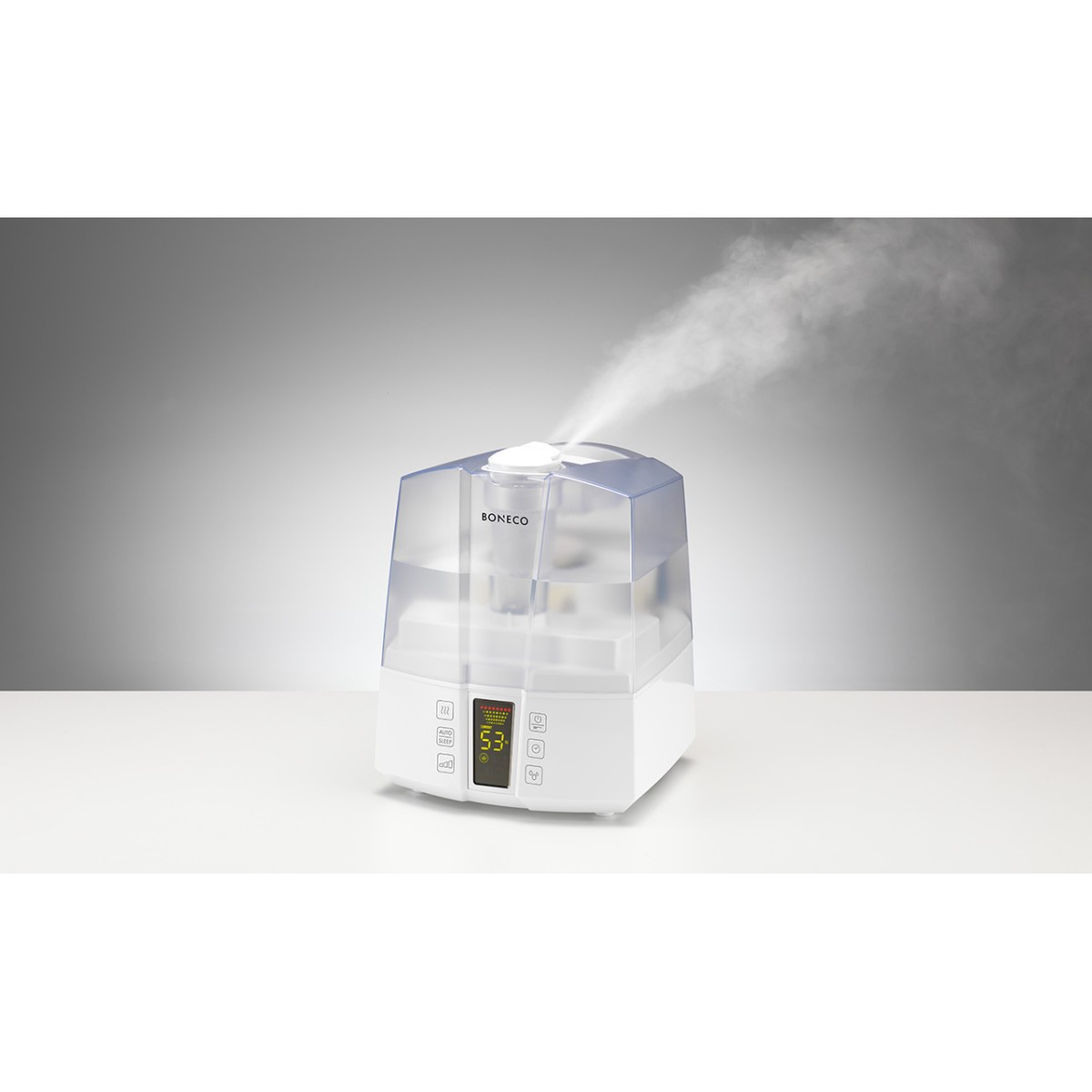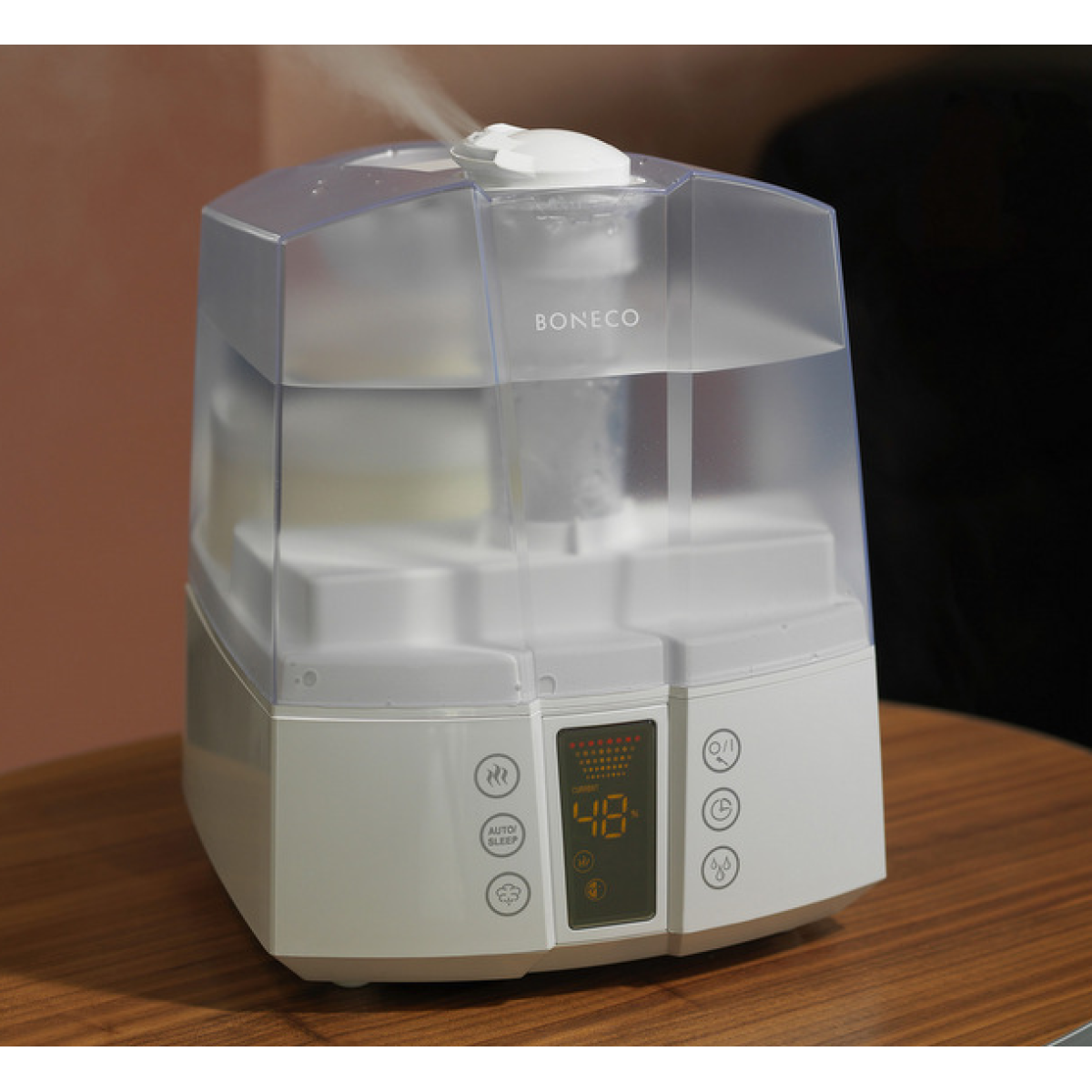 Model Boneco 7147 je komfortní ultrazvukový zvlhčovač vzduchu s vysokým výkonem. Zvlhčovač vzduchu AOS 7147 je moderní přístroj s bohatým vybavením, pohodlným a logickým ovládáním. Je vybaven hygrostatem s digitálně nastavitelným ovládáním, časovačem s rozsahem nastavení doby chodu 1–8 hodin nebo nepřetržitého provozu. Dále můžeme nastavit výkon ve třech úrovních nebo zapnout předehřev vody na 80°C, který nejen zvyšuje zvlhčovací výkon, ale zároveň likviduje bakterie. Ve zvlhčovači je použita inovovaná membrána s vyšší životností. Součástí balení je demineralizační filtr, který odstraňuje minerály z vody. Dodává v černém a bílém provedení.